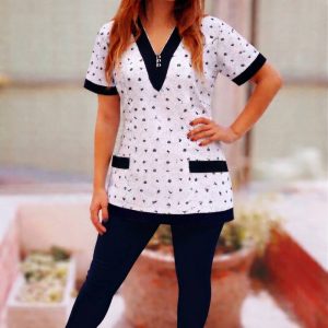 Chaqueta dama modelo Pilar de Algodón Azul con Aplicación Encaje blanco 1 argolla manga corta