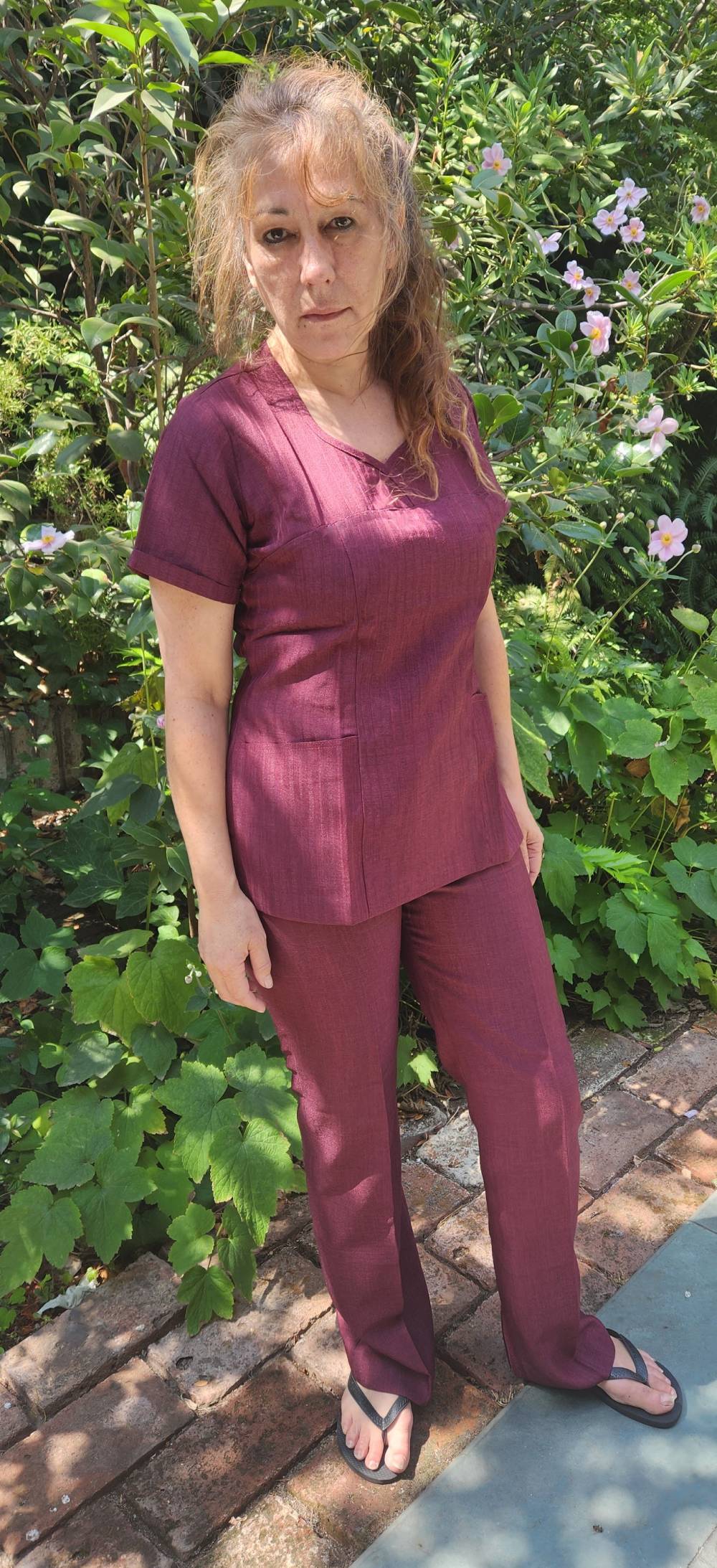 Conjunto chaqueta Alejandra burdeo pespunte blanco y pantalón