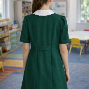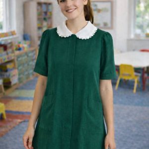 Delantal manga larga, con alforzas delanteras, cuello blanco desmontable, bolsillos laterales y cierre trasero.