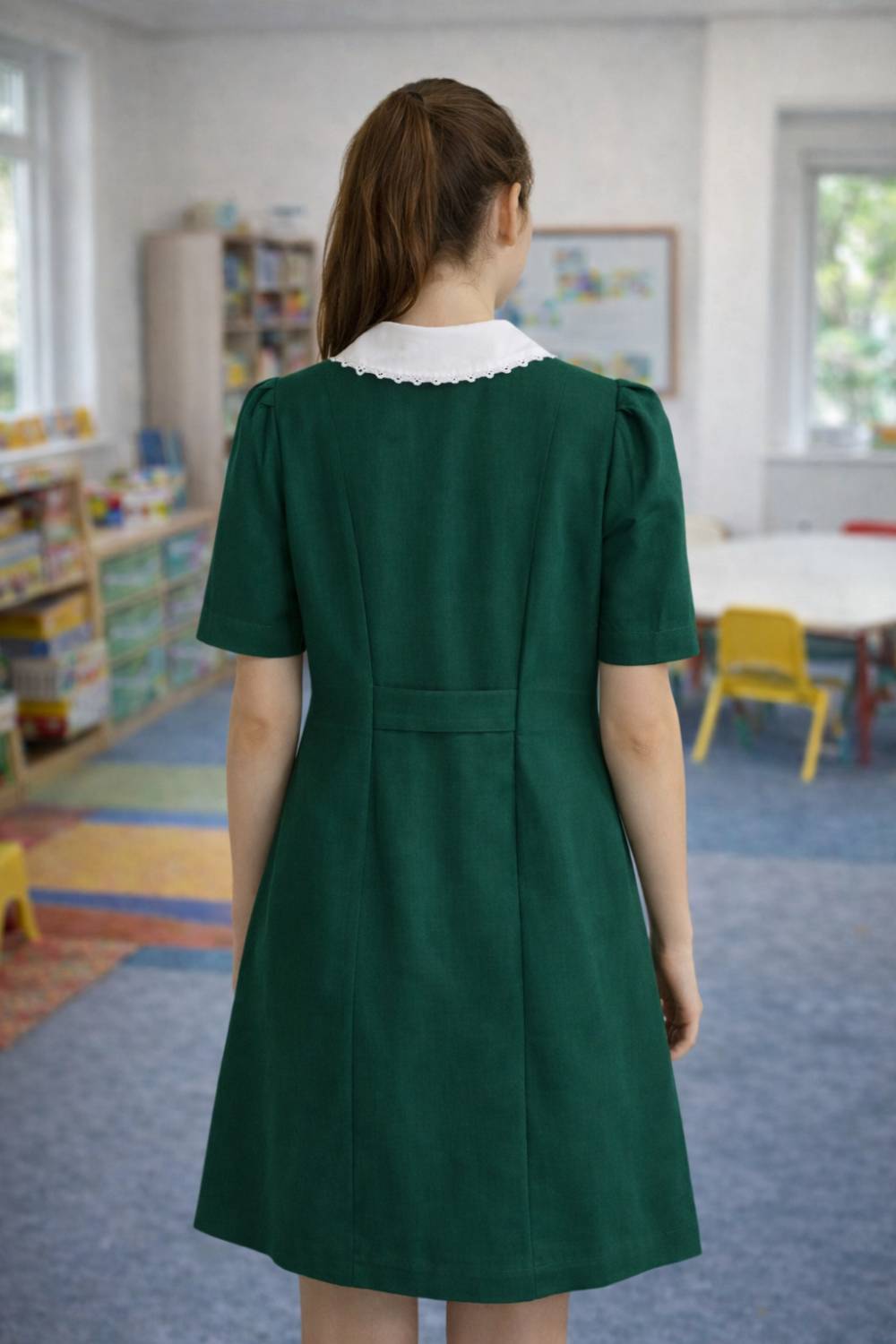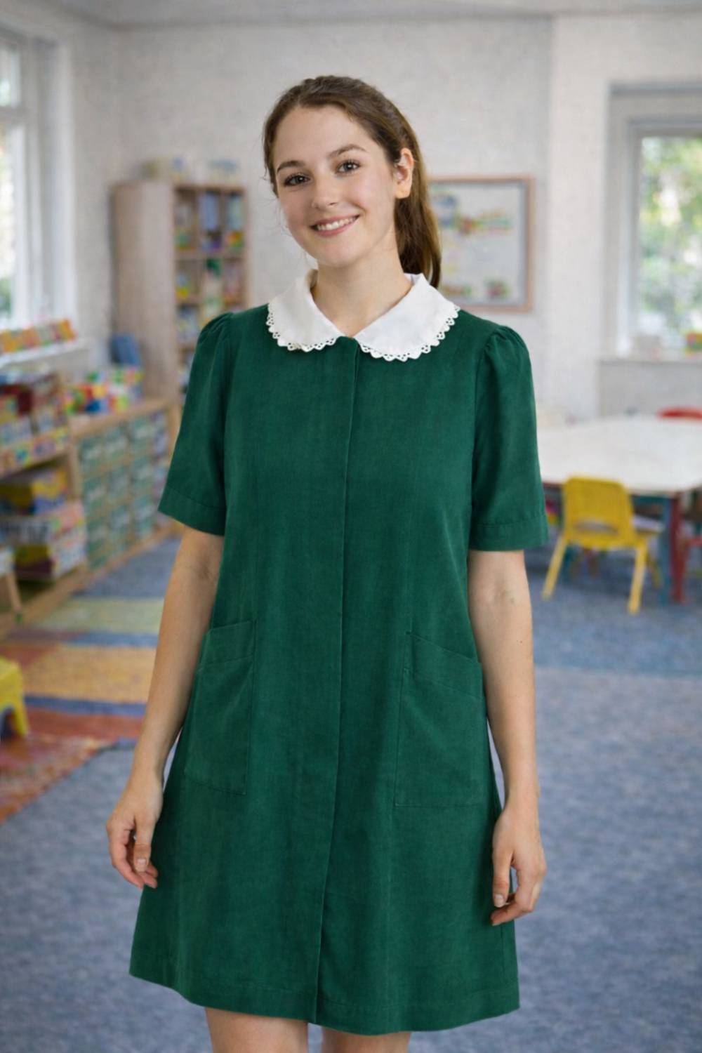 Delantal parvularia abotonado delantero, cuello blanco removible, 2 bolsillos delanteros.
