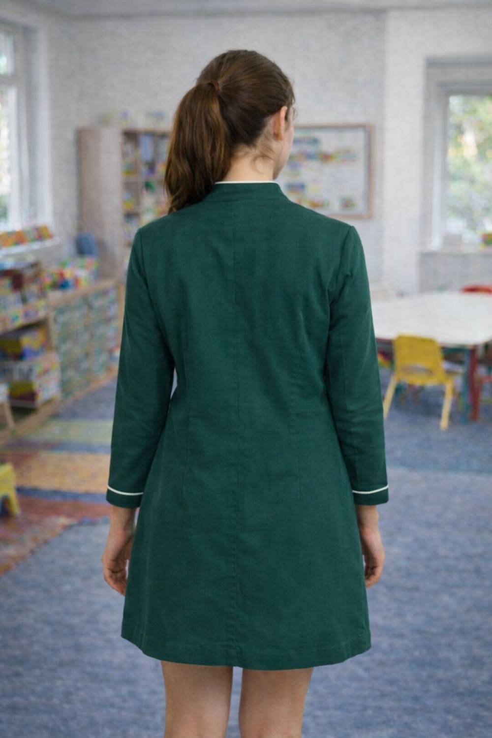 Delantal manga larga, 2 bolsillos delanteros y cierre trasero.