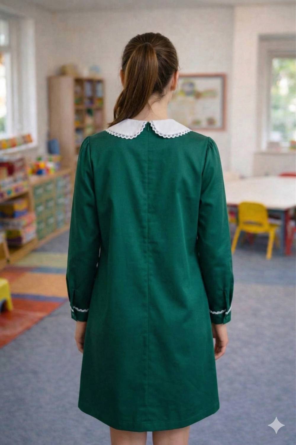 Delantal manga larga, cuello blanco desmontable, vivos broderí, bolsillos delanteros y cierre trasero.