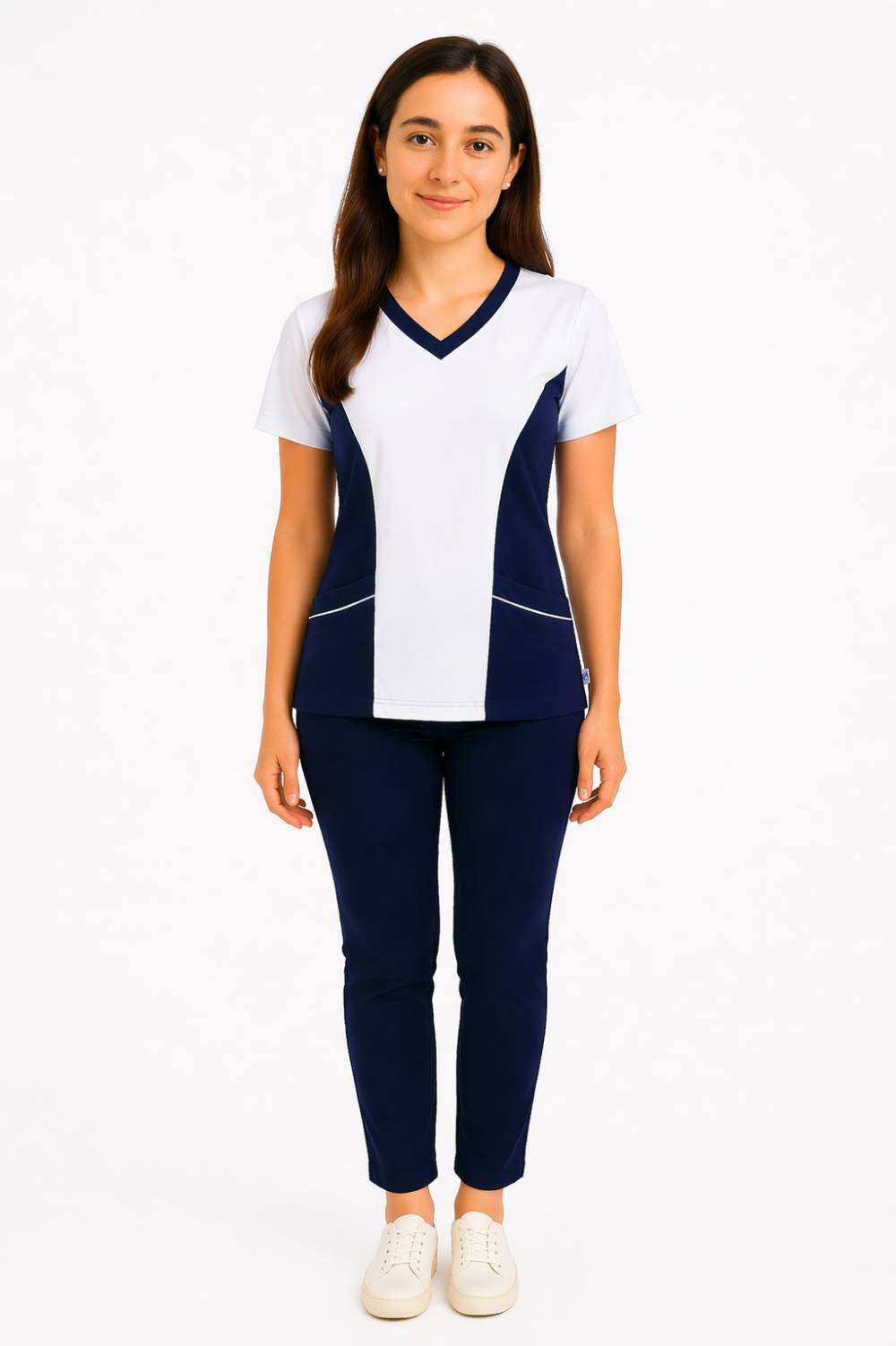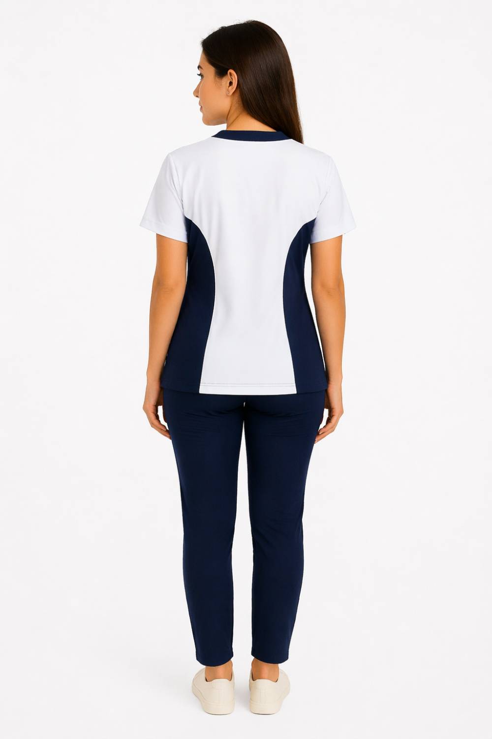 Polera modelo cuello V frente y espalda blanco y costadillo azul. Piqué, algodón o punto